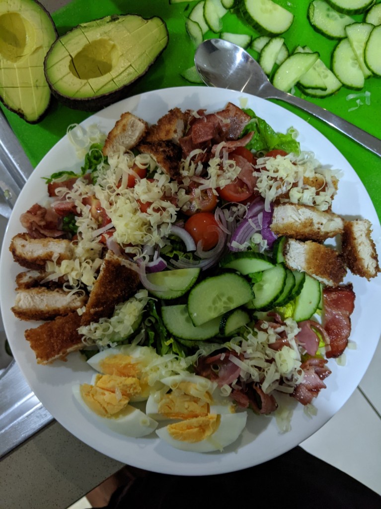 Start with a bed of your washed lettuce, I used Romain. Layer on your cherry tomato, cucumber and onions. Strategically place your bacon and chicken, and sprinkle over with your grated cheese. Put the Avocado (and/or beats) on top.