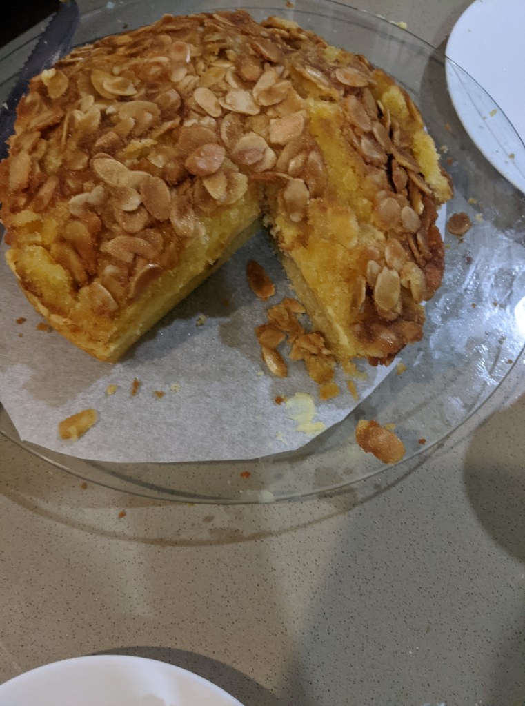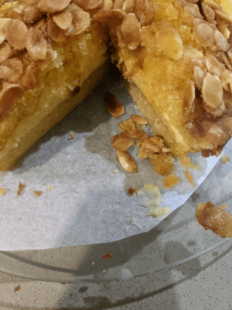 once the cake is cooled, remove from it’s pan carefully and cut it in half, I used a bread knife, separating the top layer from the bottom layer. Get your cold custard from the fridge, mix it around a bit to loosen it up, it would look like jello; spread it on the bottom layer of the cake. Place the top layer over with the almond side up.