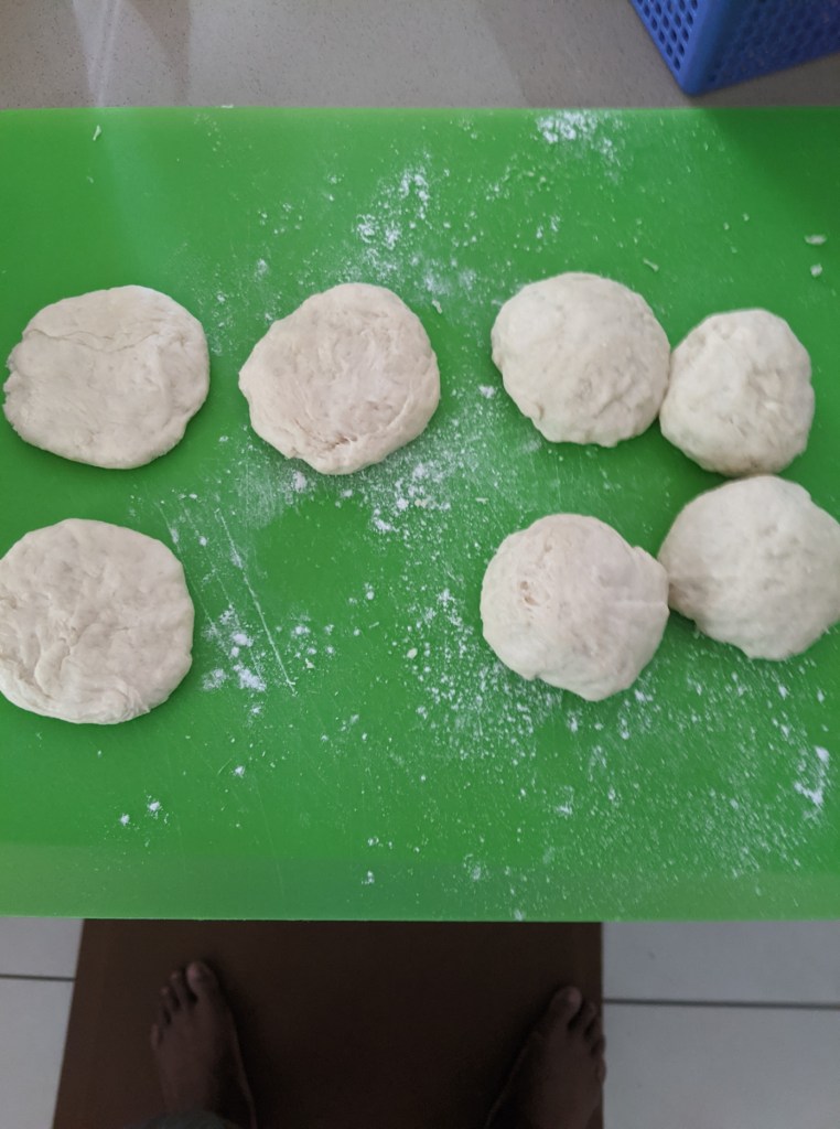Once you come back to your rested risen dough balls, flatten them to form your bakes.
