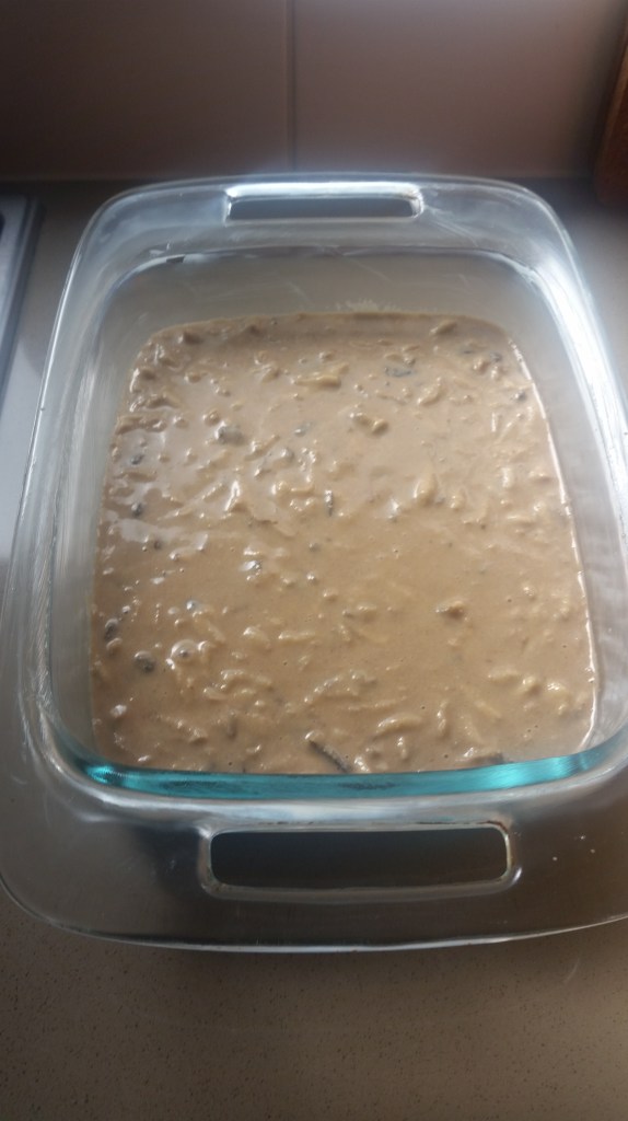 Use cooking spray or canola oil to line your baking pan and pour your batter in. This will not rise much so how deep the pan is will determine the thickness of each slice. Use a reasonably deep pan so the pudding doesn’t dry out while cooking.