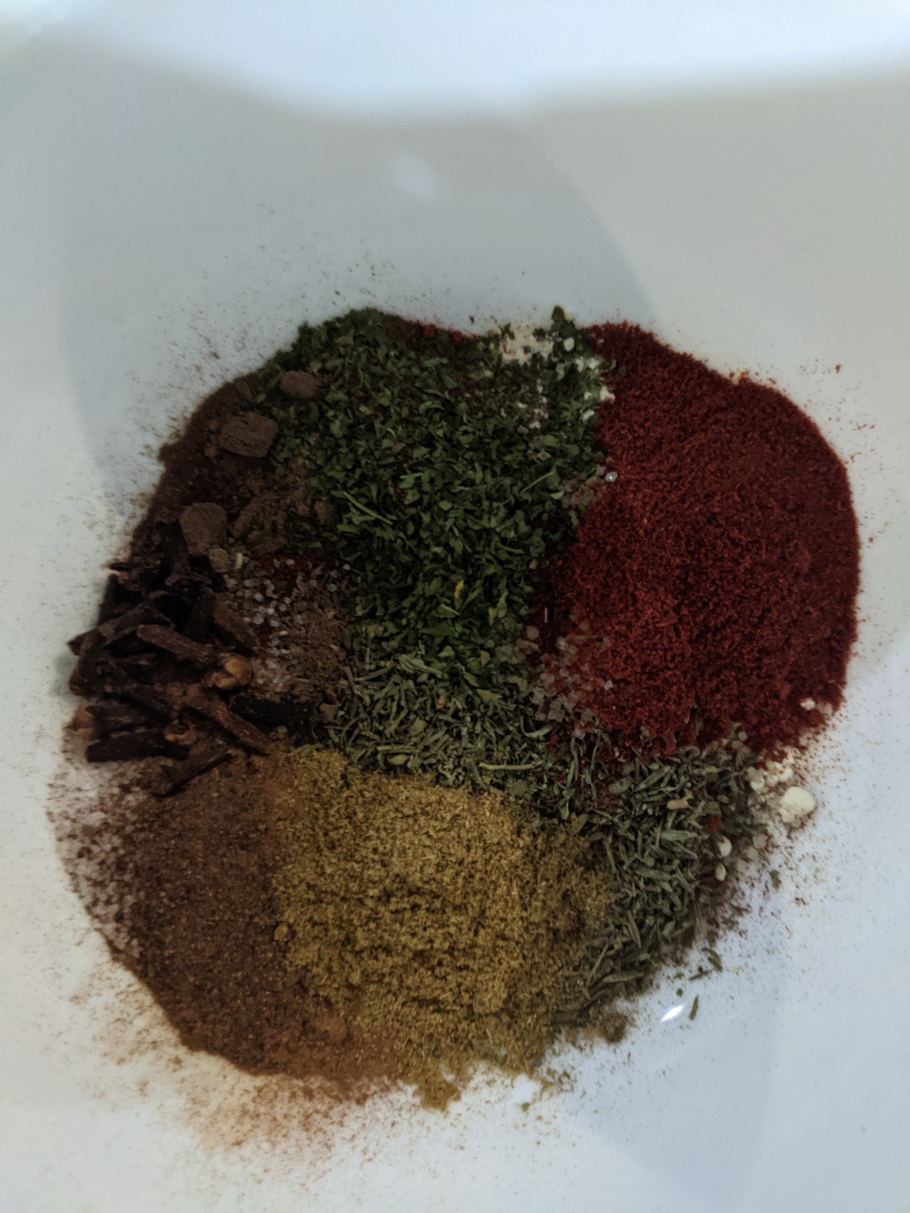 Grind your dry ingredients together in an electric grinder, store in an air tight seasoning jar for later use.