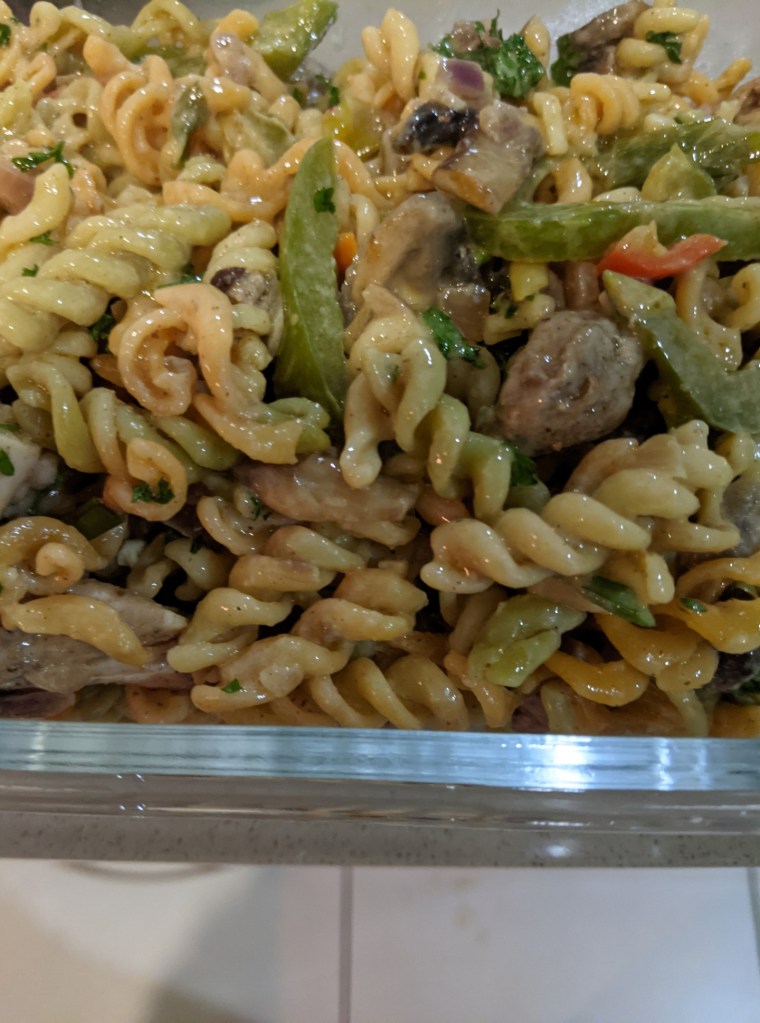 Serve this hot in winter or cold as a pasta salad in the summer. This can be Vegetarian if you leave out the chicken, use tofu or seitan.