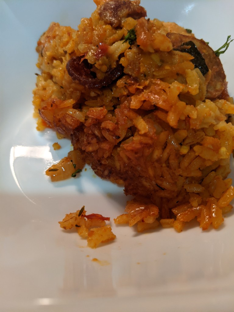 Usually made with a mixture of seafood like clams and shrimp, which I’m allergic to, this version is made with chicken and churizo, also acceptable. This meal can be Vegetarian if you left out the meat and used Vegetable stock.