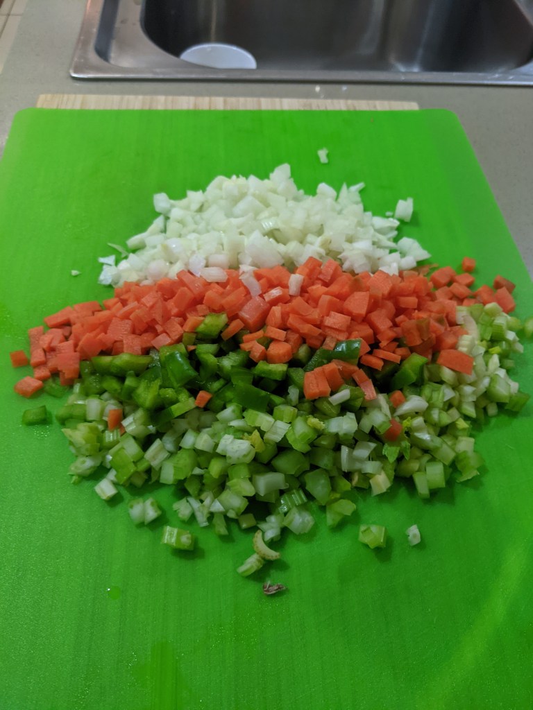 In a sauce pan, Saute’ all of your diced Vegetables until soft in olive oil, about 5 minutes on medium heat. Add your diced bacon to fry.