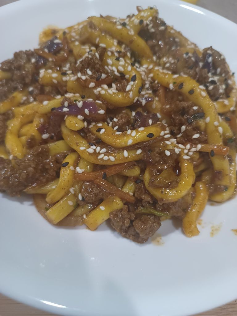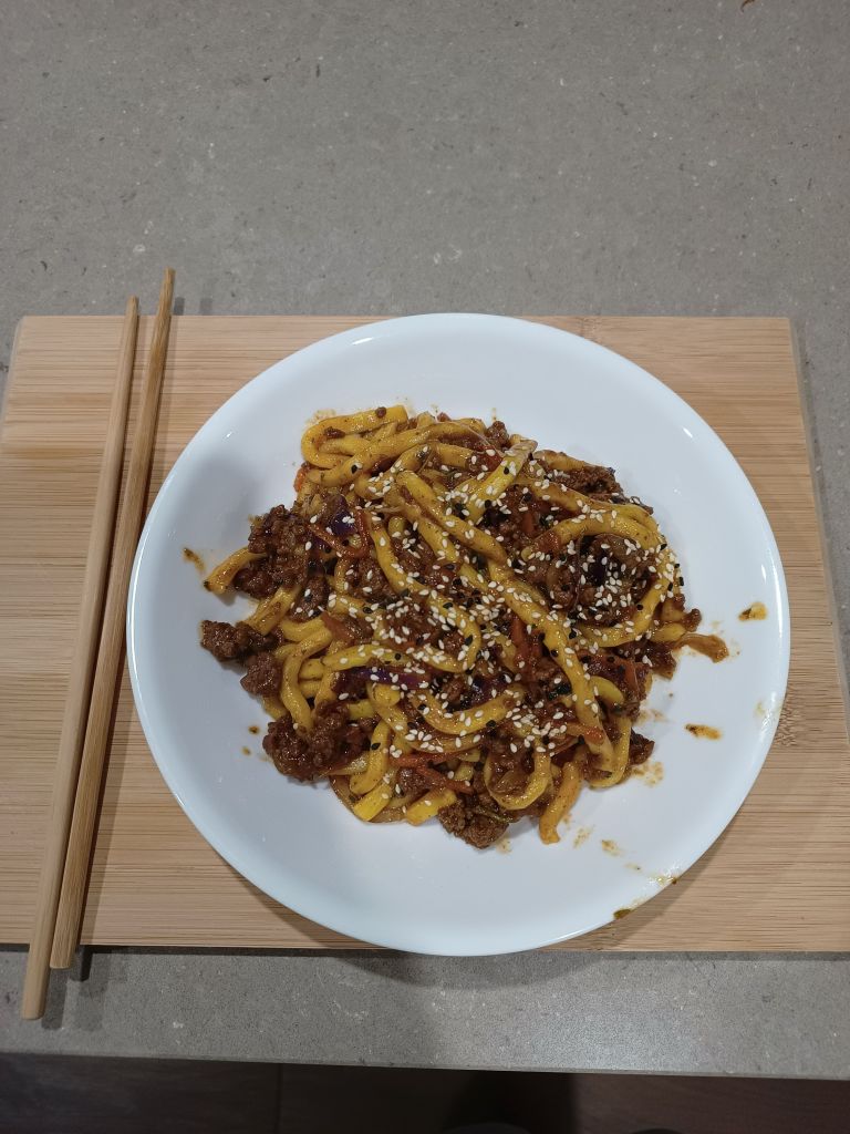 I used a packet seasoning for the sauce and an Asian salad mix from the store for the Vege. The Noodles were hoken, just soak in hot water, the fresh kind, not deep fried like ramen.