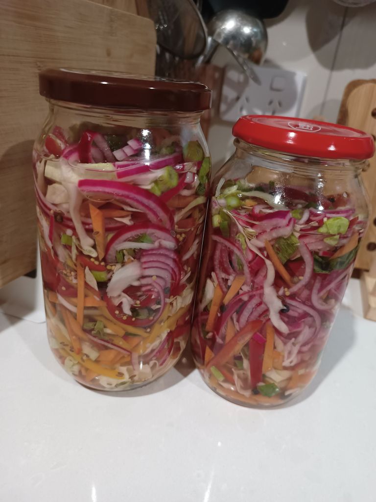 A winning condiment made by pickling onion, chillies (scotch bonet) , cabbage, carrot and green onion.